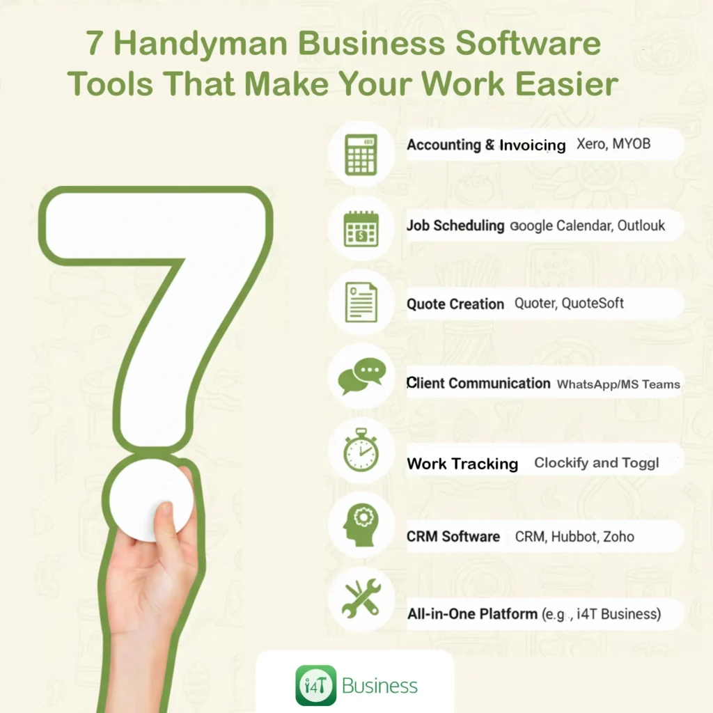 Looking for the best handyman software to save time and stay organised? The top tools for Australian tradies include Xero or MYOB for accounting, Google Calendar for scheduling, Quoter for quoting, WhatsApp Business for communication, Clockify for time tracking, i4T CRM for customer management, and i4T Business, the all-in-one job management solution that brings everything together in one platform.