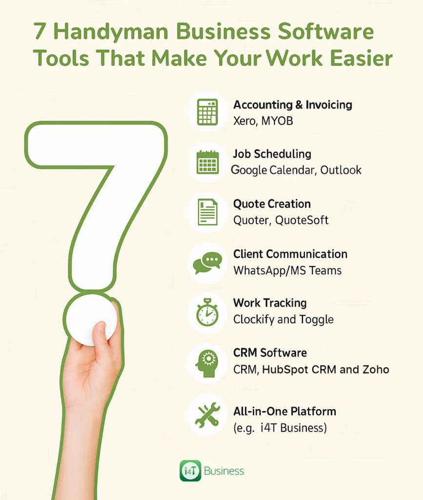 Looking for the best handyman software to save time and stay organised? The top tools for Australian tradies include Xero or MYOB for accounting, Google Calendar for scheduling, Quoter for quoting, WhatsApp Business for communication, Clockify for time tracking, i4T CRM for customer management, and i4T Business, the all-in-one job management solution that brings everything together in one platform.