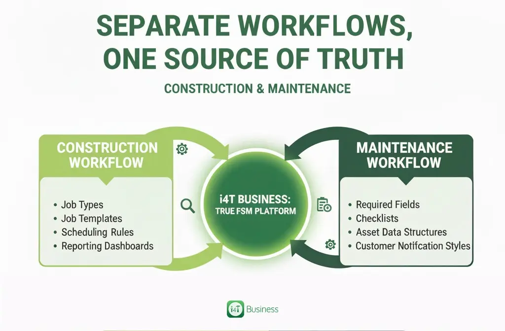 Good FSM software will treat construction and maintenance differently behind the scenes, without forcing you to juggle two platforms. And that’s why FSM tools like i4T Business let you build separate scheduling rules from day one.