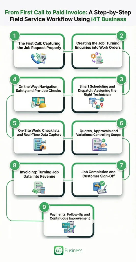 A modern field service business needs more than ad-hoc systems and paper job cards. It needs a clear, repeatable workflow that connects the first customer call to the final payment, with visibility at every step.
