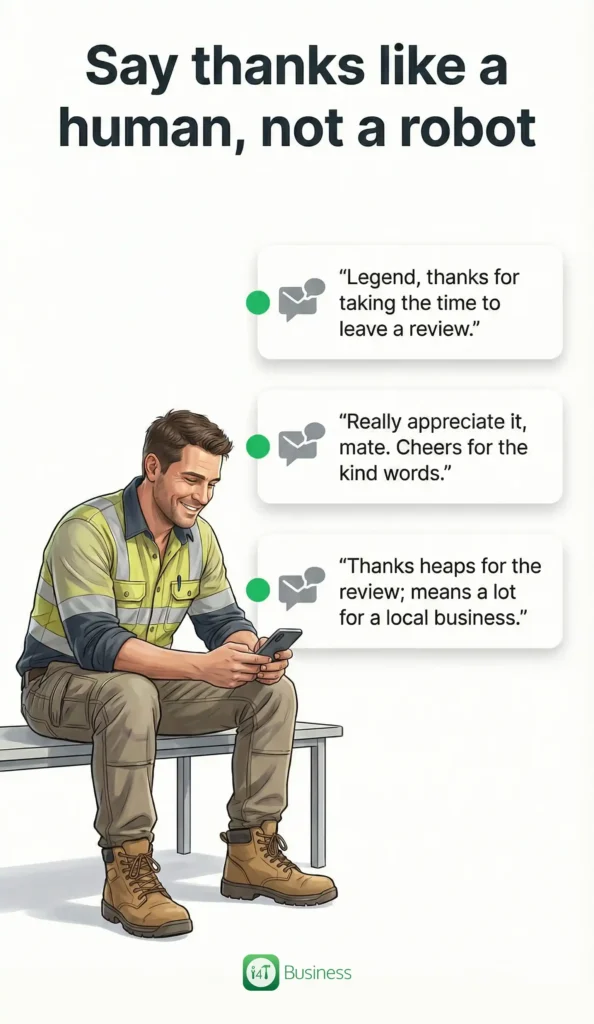 “Thank you for your feedback” is fine… but it’s not memorable. A tradie reply can be warm, simple, and still professional. Think about how you’d speak to a decent customer in person.