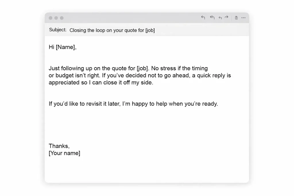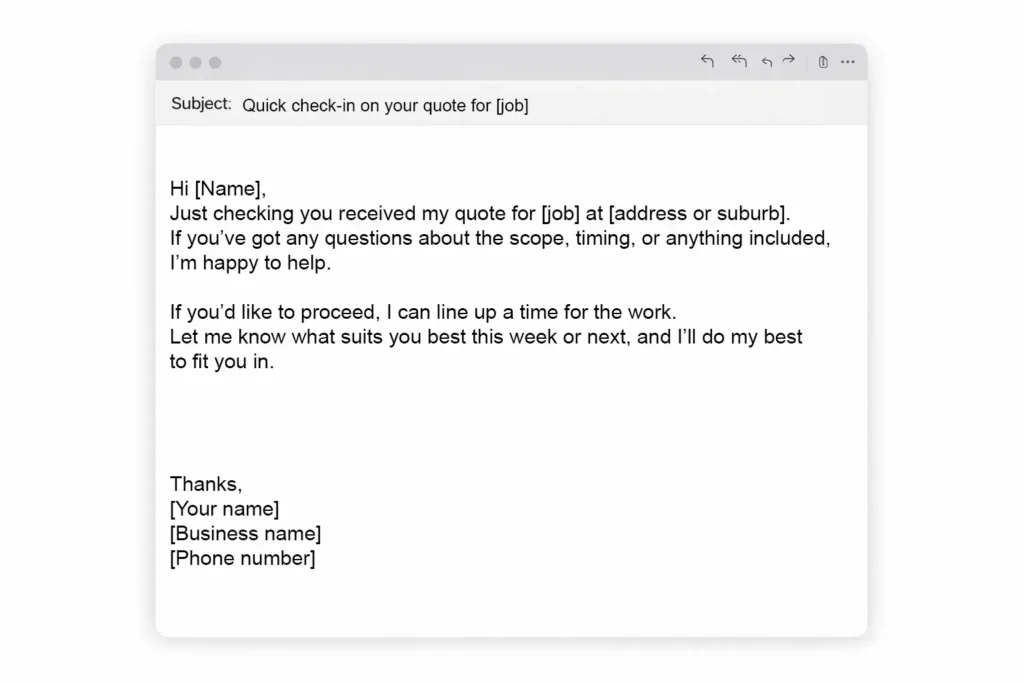 The goal isn’t to nag people. It’s to make replying easy and keep your job pipeline moving, especially when you’re flat out on the tools.